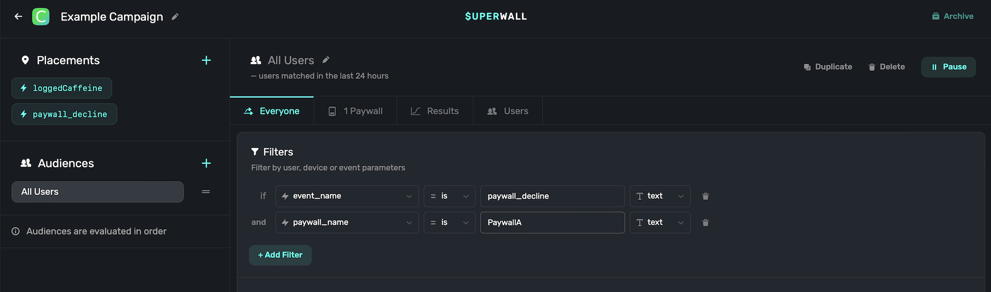This is registered when a user manually dismisses any paywall. You can combine this with rules to show a paywall when a user closes a specific paywall. First, add the standard placement to a campaign:
