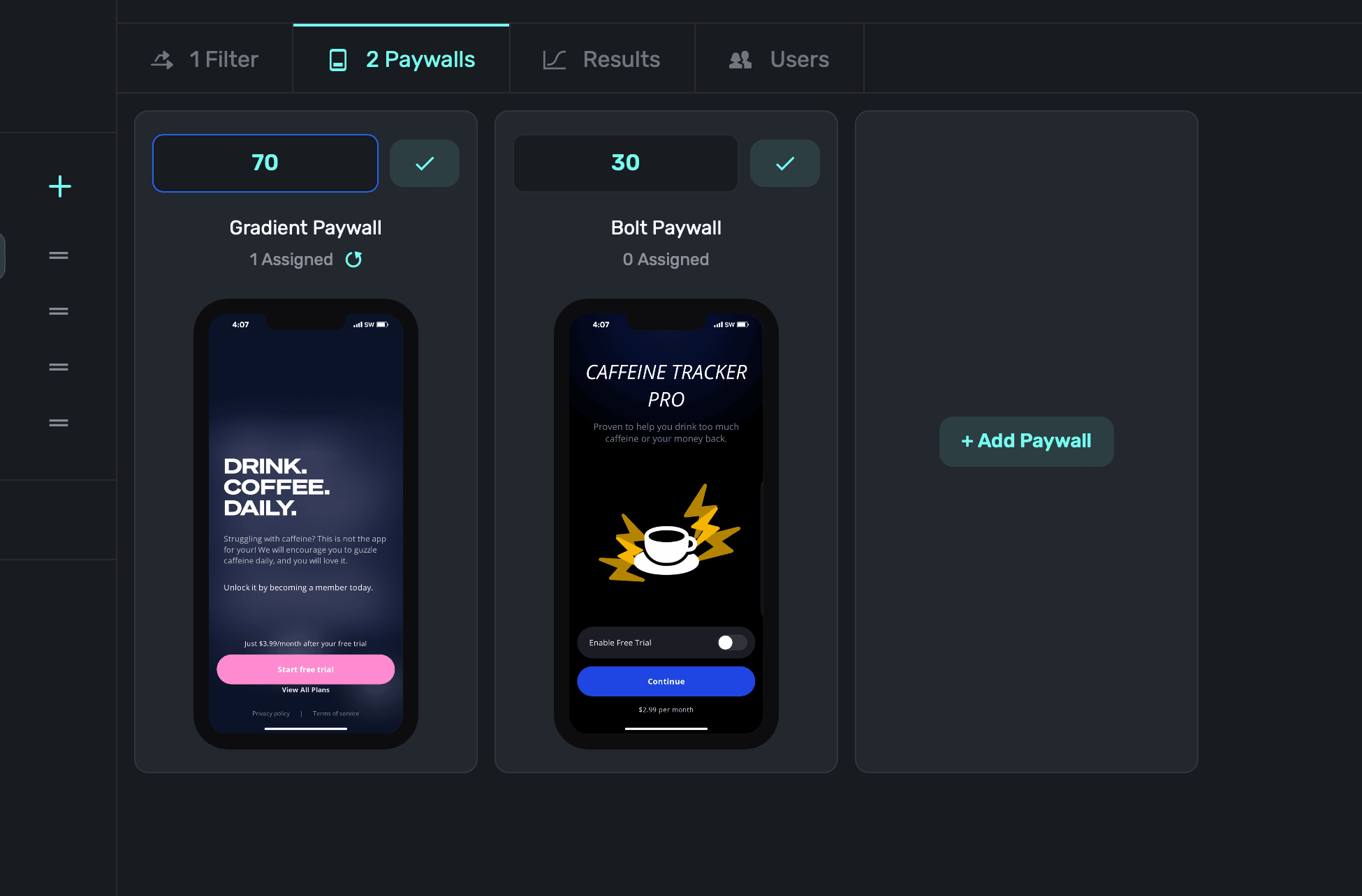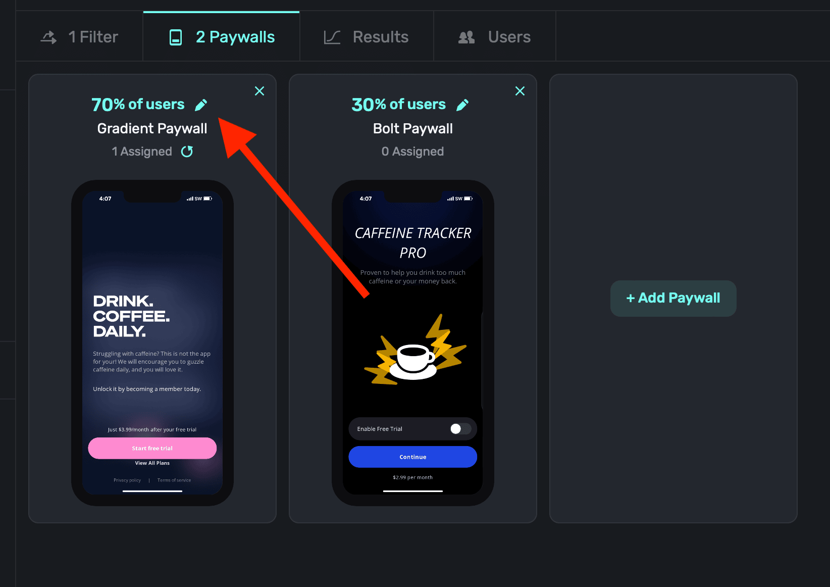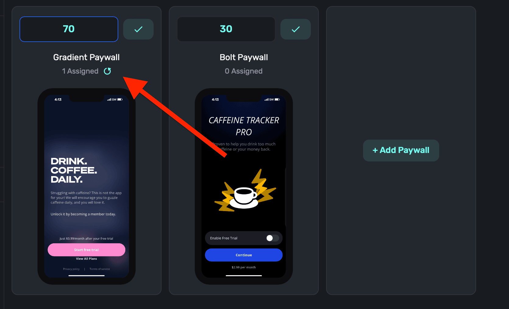 Then, assign percentages from 0%-100% for each of them. In total, your percentages should equal 100 (i.e. paywall A shows 10%, paywall B shows 30%, and paywall c shows 60% of the time) unless you're purposely creating a holdout. When you're done, click the Checkmark icon below any paywall: