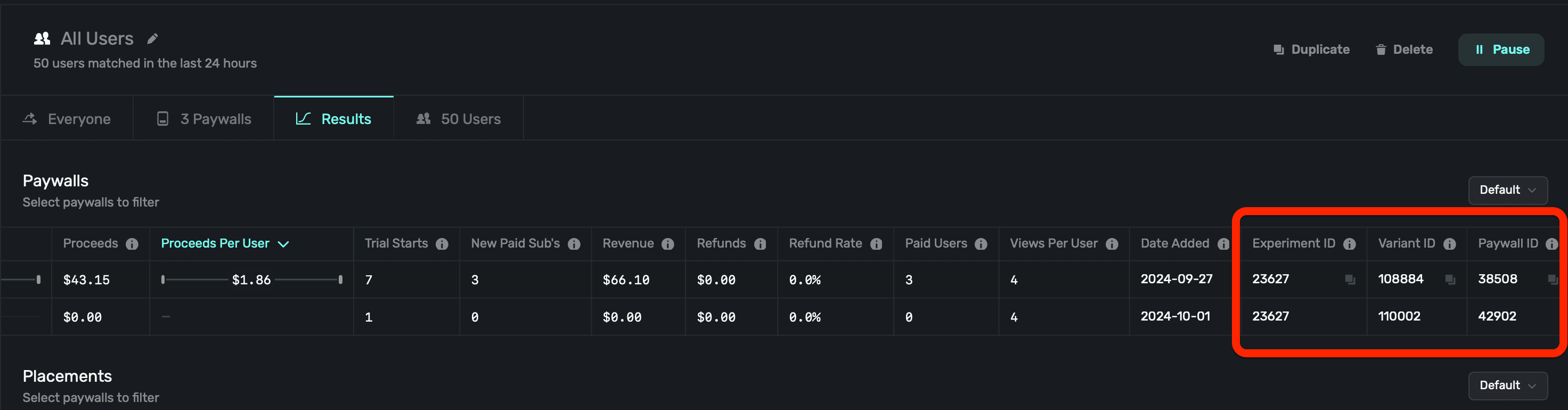 - Paywall id: The identifier for the paywall in the experiment, which associates back to the variant.