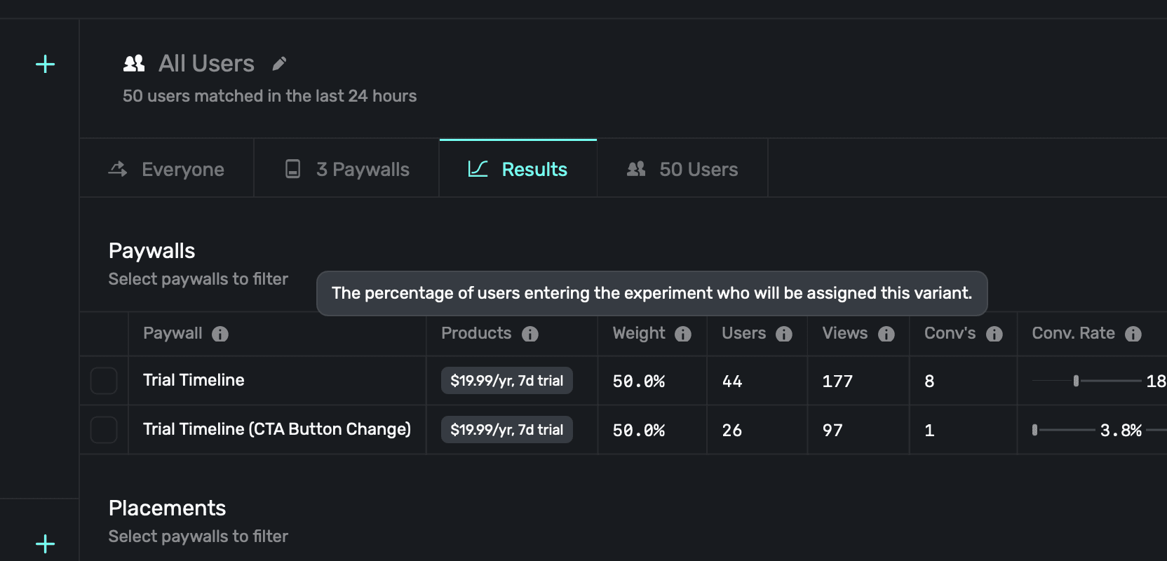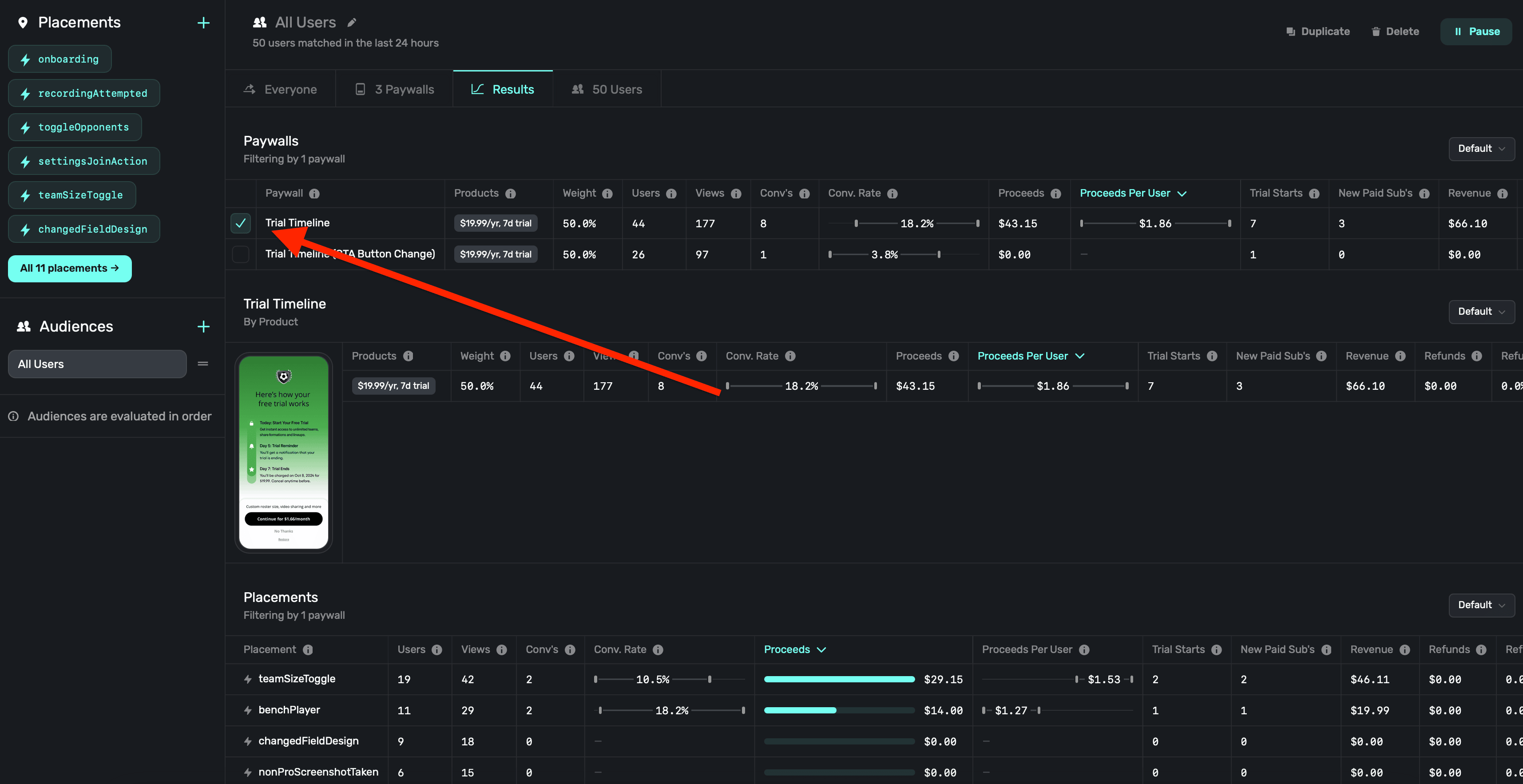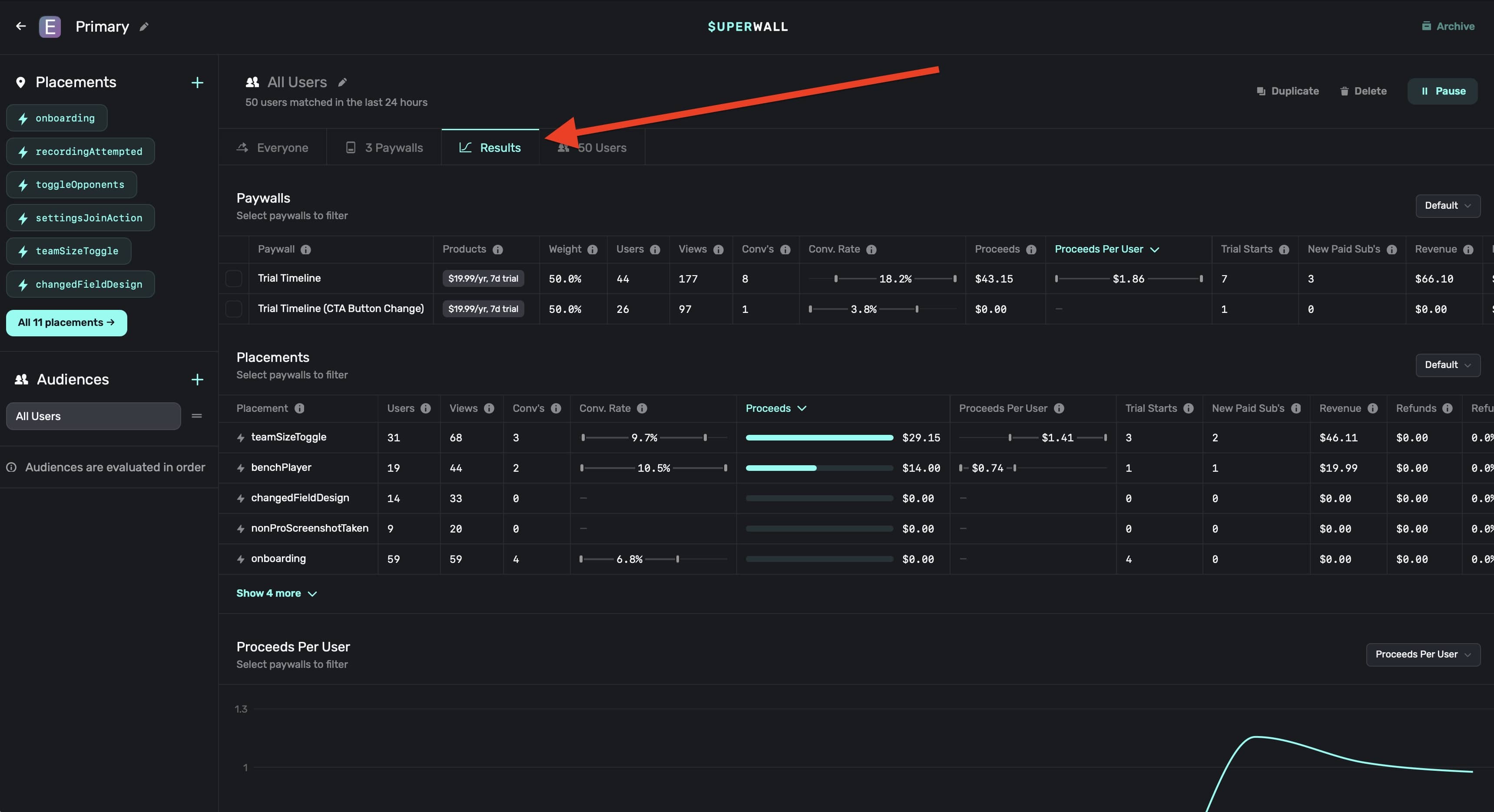 To view the results of any paywall experiment that's running, click the Results tab in the campaign details view: