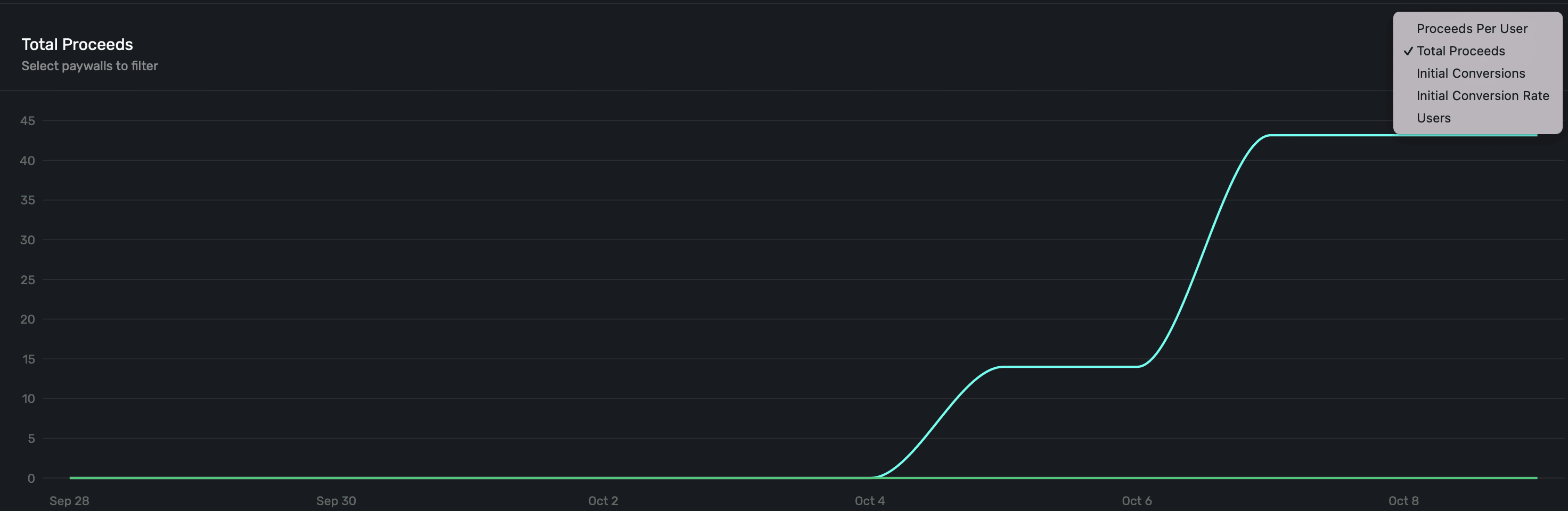 Here, you'll see each paywall being used (or that was used) in an experiment. Superwall will show you metrics such as proceeds, users and much more. There are several metric to explore, and you can hover over any of them to get more details about what each metric represents: