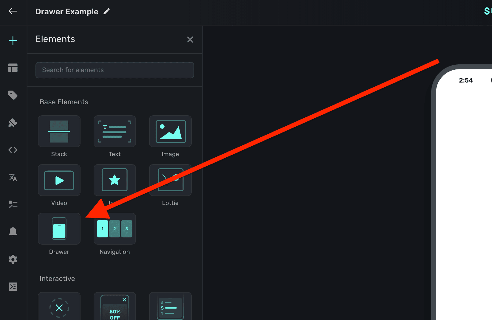 Drawers will automatically show a dimming view behind them when presented. Tapping on it will dismiss the drawer. By default, they are interactive — meaning they can be dismissed via a drag gesture. You can also change this to be manual, letting you explicity control when it presents or dismisses. Toggle this under the Dismissable property: