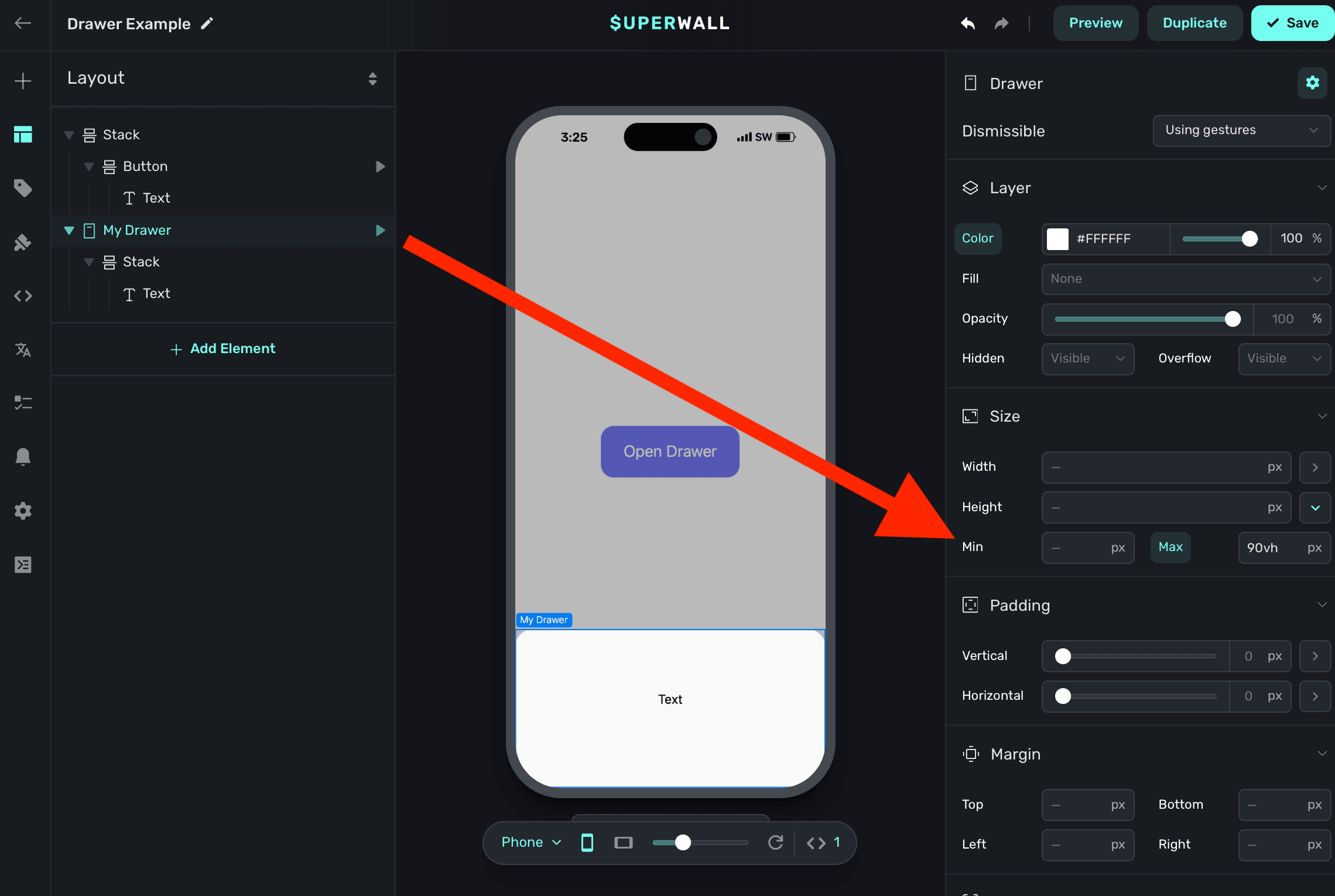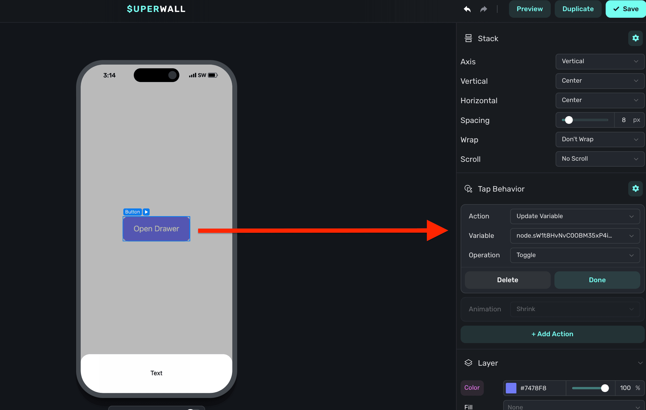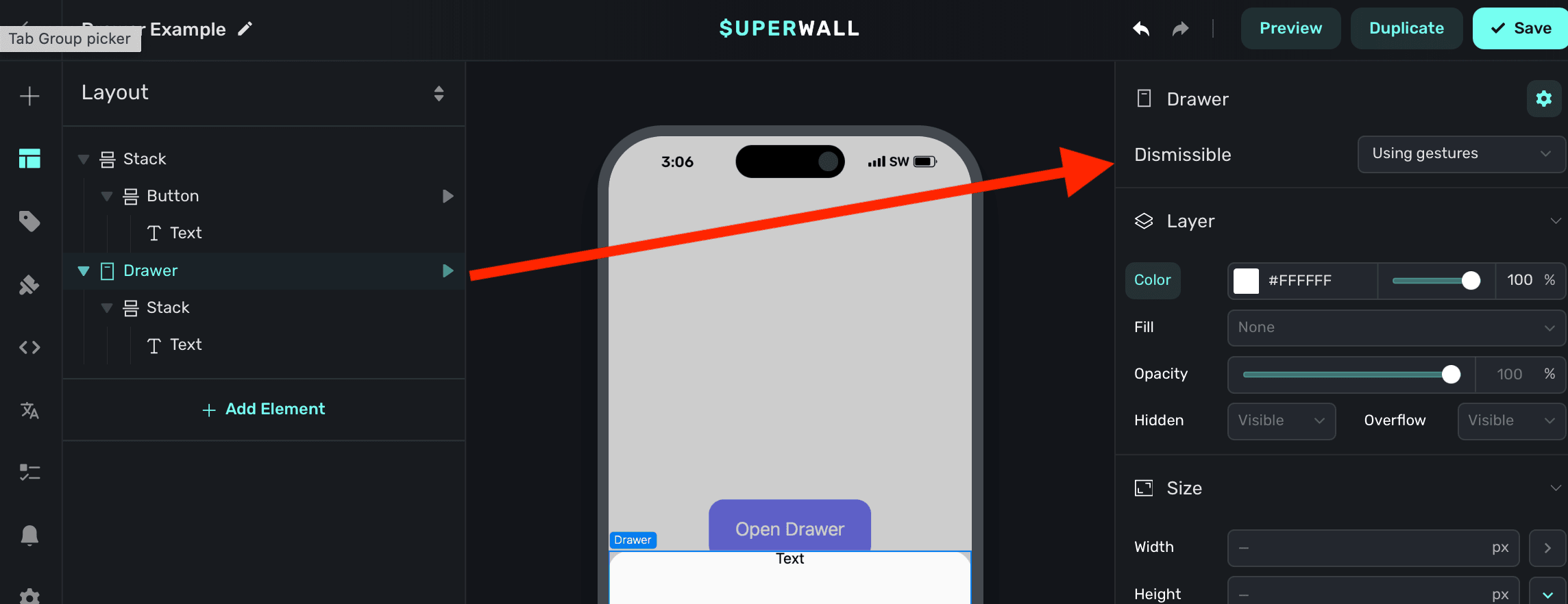 Use Superwall's drawer component to display content presented in response to a button tap or a variable changing.