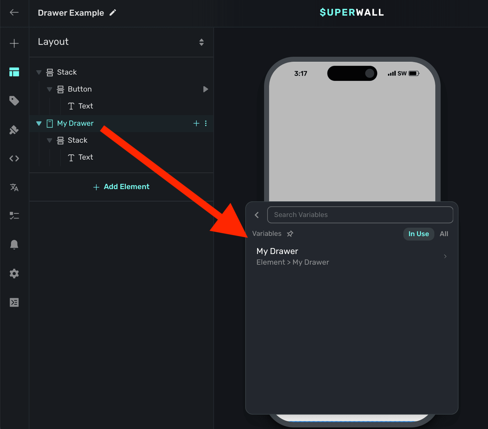 When a drawer element is added, Superwall automatically creates an element variable for it (accessed through the Variables tab in the left sidebar, or the variables button in the floating toolbar). Its name will match whatever is in the element hierarchy in the left sidebar: