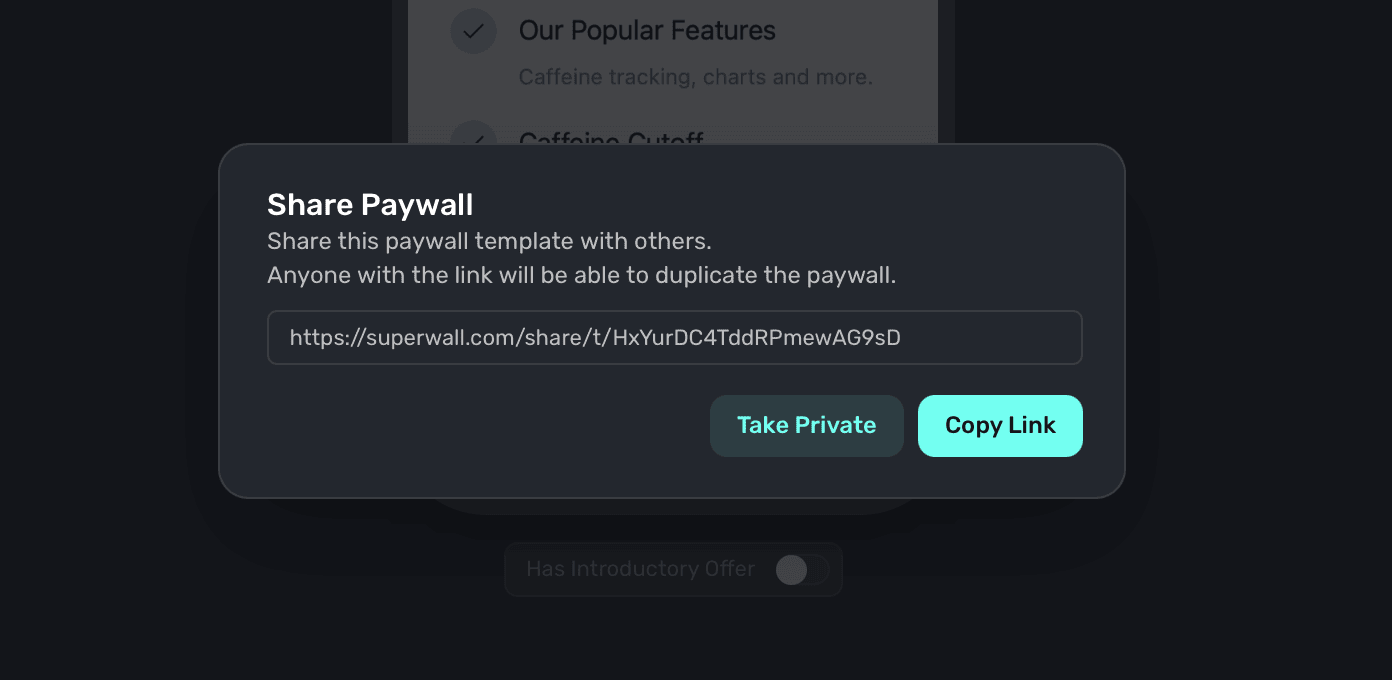 Clicking the share icon allows you to share your paywall externally. This is useful for sharing with your team or clients. Once you click on share, you'll be prompted to generate a link: