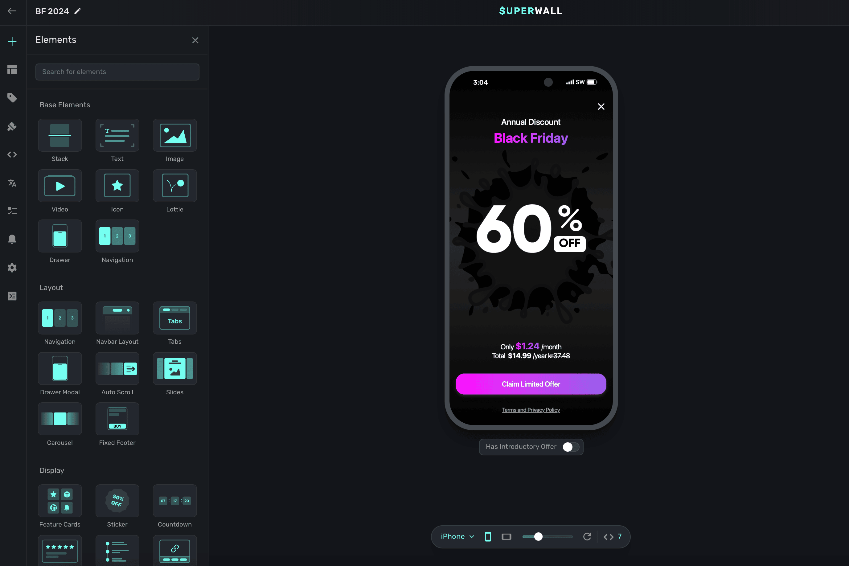 Click the + in the left sidebar or in the Layout tab to select an element to add to your paywall. This will present our library of components along with any snippets you've made (along with some of our own stock recipes):