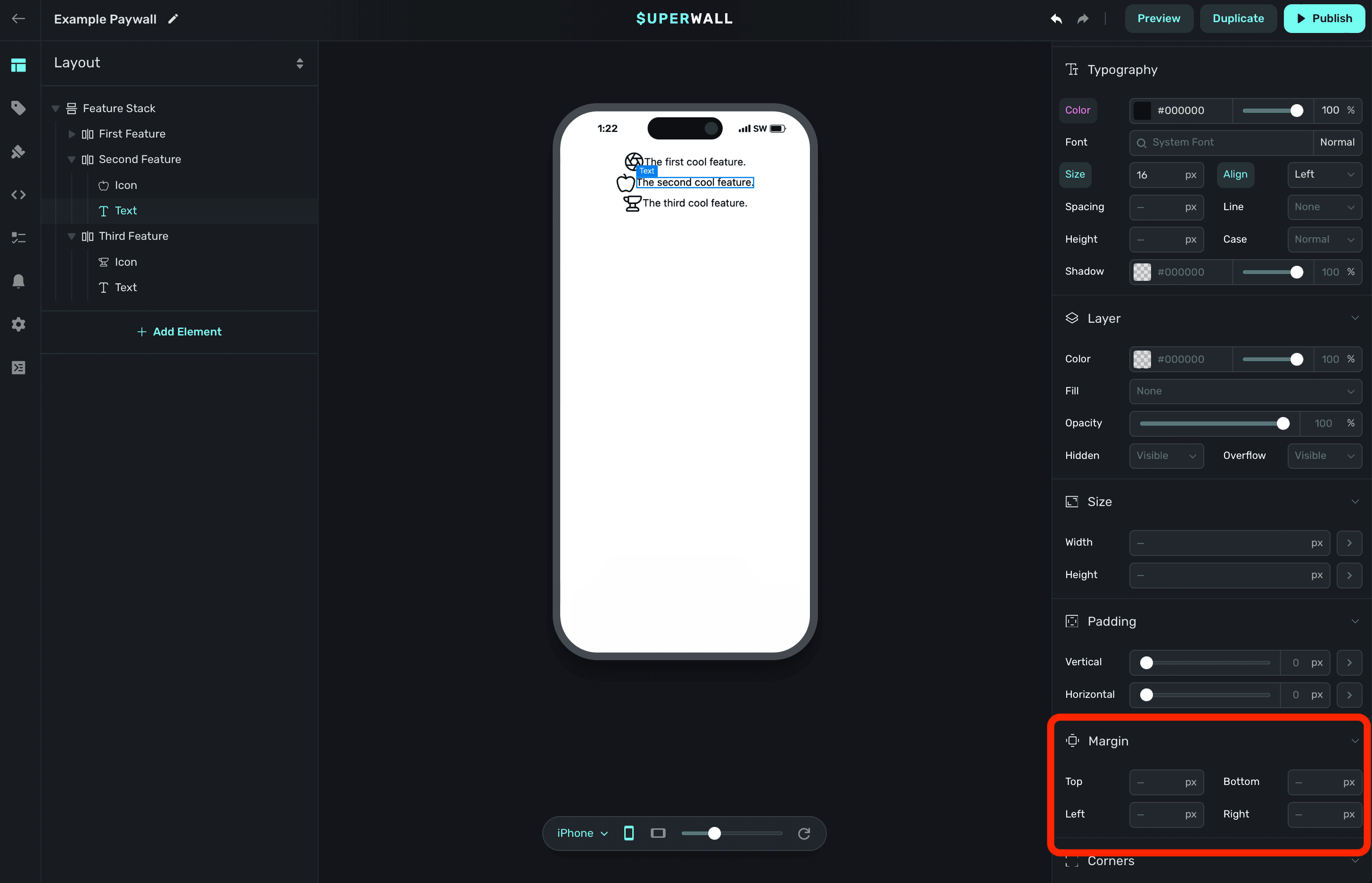 - Absolute: Removes the component from the normal paywall hierarchy flow and positions it relative to its nearest positioned component (which won't necessarily be a parent component).