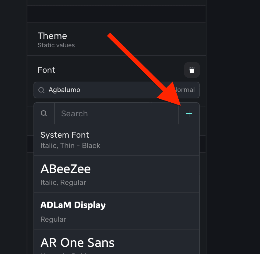 Additionally, you can add a custom font by selecting a text component, and under the Typography section in the component editor, click the + button: