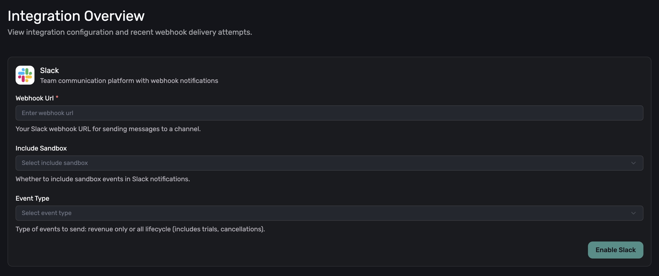 The Slack integration sends real-time notifications about subscription events to your Slack channels. Get instant updates about new subscribers, cancellations, renewals, and revenue changes with rich, color-coded messages and contextual emojis.