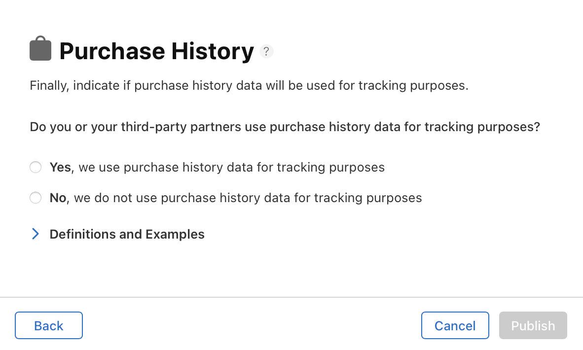 Finally, Superwall does not track purchase history of users for advertising purposes — so you can choose "No" here (unless you're using other SDKs which do this, or you're performing any purchase history tracking for advertising purposes on your own ):